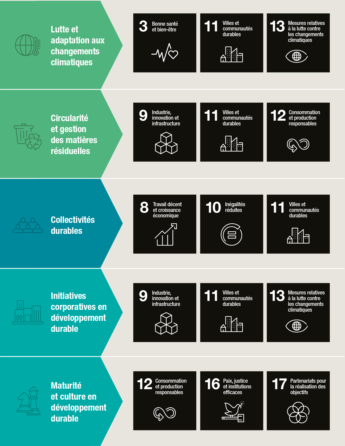 Les chantiers en développement durable établissent les 5 grandes priorités de l'organisation pour mettre en œuvre sa Stratégie de développement durable d'ici 2028. Chaque chantier est décliné en un plan de travail qui regroupe les actions complémentaires menées par la SQI, qu'elles soient inscrites dans le Plan d'action de développement durable 2023-2028, dans le Plan stratégique 2023-2027 ou menées indépendamment d'une planification corporative en soutien aux actions d'exemplarité de l'État.