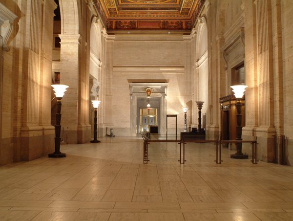 La progression est très importante dans l’ensemble de l’œuvre de Cormier, plus particulièrement dans ce bâtiment. Depuis la rue, l’usager gravit l’escalier pour passer sous l’entablement extérieur et aboutit dans l’exèdre avant de pénétrer dans ce vaste hall qui distribue dans son axe principal, la Cour du Roi par un escalier latéral. Les torchères et les appliques murales réalisées par l’atelier parisien d’Edgar Brandt animent l’arrivée des visiteurs depuis l’exèdre jusqu’aux salles d’audience. Façonnées selon les esquisses de Cormier, elles sont très représentatives du début du mouvement de l’Art déco. L’ensemble des matériaux et des proportions se décline du public au privé. Les plafonds peints du grand hall sont remplacés par des plafonds moulurés dans les espaces de travail des greffiers. Les pierres naturelles sont remplacées par de la pierre de Caen dans les espaces de circulation, les archives et les salles destinées à recevoir le jury.