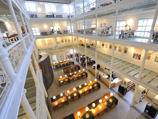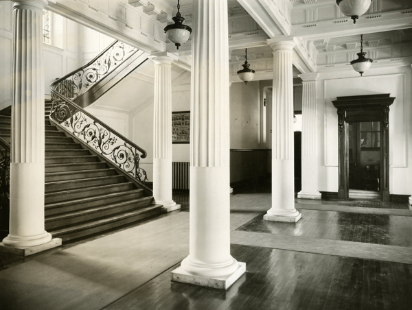 L'intérieur a été transformé pour les besoins du centre d'archives, mais le hall d'honneur reste remarquable avec ses plafonds en caissons et d’un escalier à deux branches avec rampes en fer forgé menant à un atrium. Grâce au don de Power Corporation en 1999, quatre statues de marbre, Les Géantes du sculpteur Henry Augustus Lukeman, se dressent dans cet atrium. Elles proviennent de l'ancien siège de la Banque Royale, rue Saint-Jacques, et représentent les quatre industries majeures du début du XXe siècle : les mines, l'agriculture, les pêcheries et le transport.