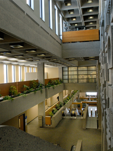 L'enveloppe de béton contient les conduits de climatisation qui se distribuent dans les plafonds à caissons, permettant une grande souplesse dans l'aménagement des espaces de travail. Aujourd’hui compartimentée pour des motifs de protection incendie, l'aire ouverte autour des circulations verticales créait une atmosphère singulière, définissant l'esprit brutaliste du bâtiment en permettant d'accéder à tous les bureaux en périphérie. Situé aux limites des arrondissements historiques du Vieux-Québec et de l’Assemblée nationale, le projet pourrait être soumis aux exigences d’approbation de ces derniers.