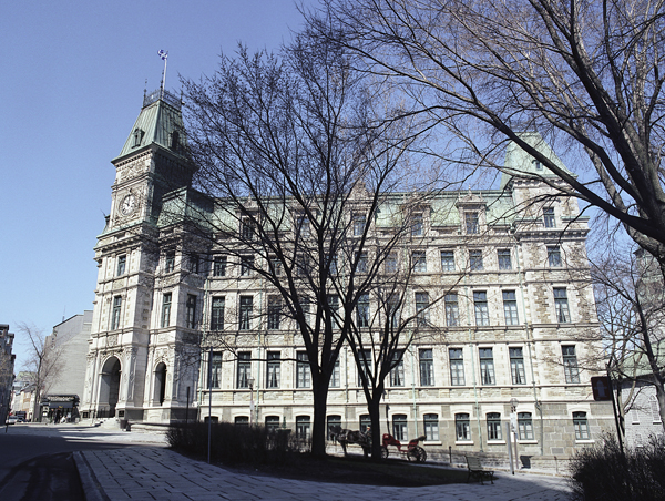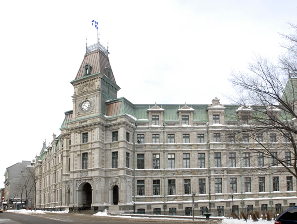 Classé monument historique, l’ancien palais de justice de Québec est un édifice institutionnel d’influence Second Empire construit entre 1883 et 1887 par l’architecte Eugène-Étienne Taché (1836-1912). L’influence Second Empire est illustrée, entre autres, par les élévations en pierre qui adoptent une composition hiérarchisée et symétrique, par la façade disposée à angle soulignée par un avant-corps central surmonté d’une tour d’horloge, par les tours d’angle aux extrémités des ailes, ainsi que par le toit mansardé qui coiffe l’ensemble. Les motifs héraldiques élaborés par Taché ornent la façade ainsi qu’un « ordre québécois » symbolisant les nations fondatrices. L’ancien palais de justice fait appel au vocabulaire architectural Second Empire pour asseoir le prestige et la respectabilité de l’institution, alors que l’ornementation héraldique affirme son appartenance québécoise et canadienne.