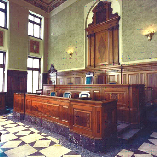 La valeur patrimoniale de l’édifice repose également sur l’intérêt de son aménagement et de son décor intérieur, qui traduisent l’importance de l’institution. Ces éléments sont entièrement réalisés entre 1927 et 1934, d’après les plans de Sylva Frappier (1874-1951), architecte du département des travaux publics de la province de Québec. Conçu selon l’esthétique Beaux-Arts, le décor est notamment caractérisé par l’utilisation de matériaux nobles (marbre, bois et laiton), ainsi que par sa polychromie. Il est concentré dans les espaces de circulation, la bibliothèque, la salle du Barreau et les bureaux des juges en chef. Le hall d’entrée, de plan elliptique, comprend un escalier monumental en « U », des murs recouverts de marbre, des portes en laiton et des plafonds garnis de rosaces. Les couloirs du rez-de-chaussée et du deuxième étage possèdent des plafonds à caisson richement peints et dorés ainsi que des pilastres engagés à chapiteau orné. Plusieurs salles sont pourvues de lambris en bois, de moulures de plafond, de puits de lumière et de détails en plâtre doré et polychrome. Ce décor, qui forme un ensemble homogène, figure parmi les plus riches intérieurs d’édifices publics au Québec.